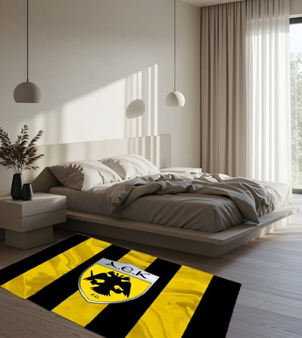 Νέα σειρά χαλιά που απεικονίζουν το Δικέφαλο Αετό του Βυζαντίου με ανοικτά φτερά που θα εντυπωσιάσει τους κιτρινόμαυρους οπαδούς . Ένα εντυπωσιακό χαλί, κυρίως σε αποχρώσεις του κίτρινου και μαύρου. Είναι διαθέσιμο σε δύο μεγέθη, όπως 120x160cm και 160x220cm. Αντιολισθητικά χάρη στη σύνθεση του πίσω μέρος του προϊόντος, για τη μέγιστη ασφάλεια του παιδιού σας.